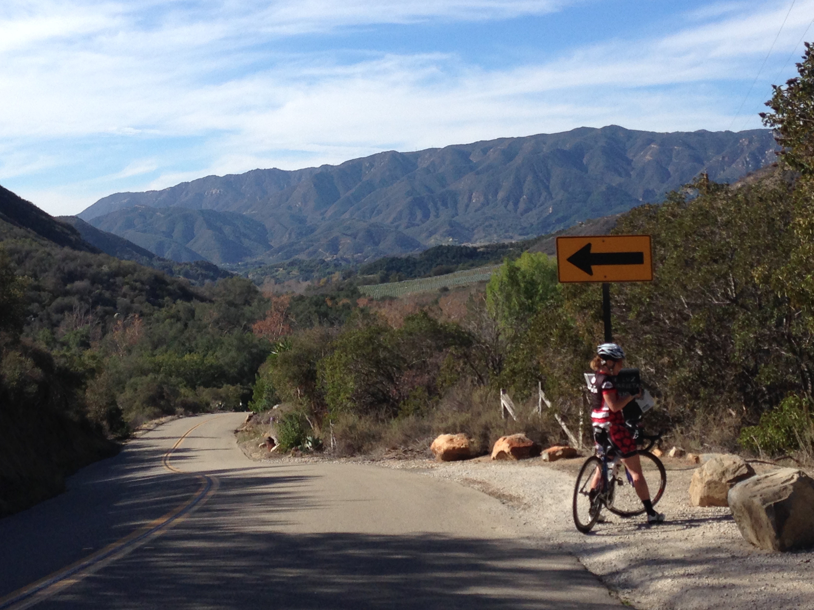 Not long after passing through the Morro Hills area, we found ourselves entering the town of Fallbrook. As we passed through the town, we took note of such things as a donut shop (wouldn’t mind hitting that joint on the return!), a “Bicycles” sign (presumably advertising a bike shop), and not long after, the sound of air releasing from Jill’s back tire. We were within yards of De Luz Road when we had our first sideline. Jill ably changed the tube, and not long after, we were on our way again.