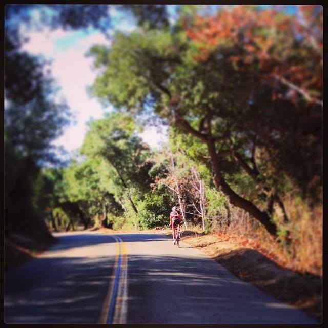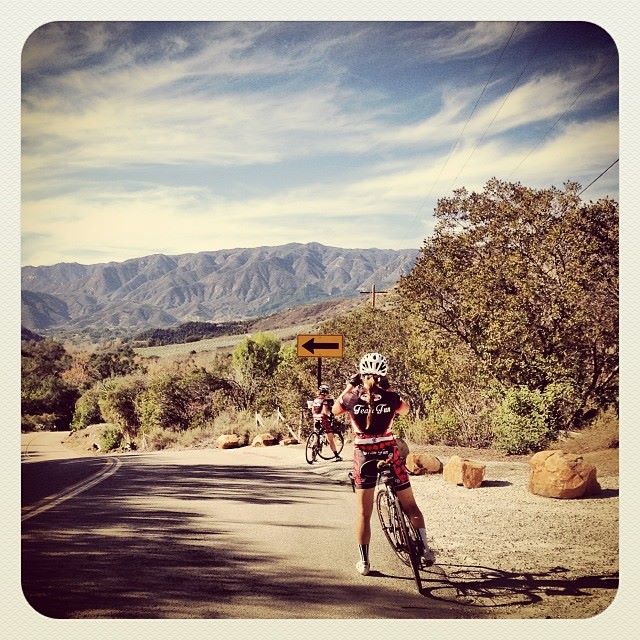 De Luz Road descends pretty sharply into the midst of wild countryside, or so it would seem to your average North County coastal cyclist. Roads heavily shaded by trees, strangely in an autumn-like state (orange, pale yellow, and browns), twist and turn … and twist and turn… and then, whoa! They shoot up, real quick. We took the right turn onto Sandia Creek, and not long after, encountered one of the most difficult stretches of road I’ve been on in a long time (Coronado Hills, last part of Monte Bondone, Pine Creek at Laguna… all come to mind). I took a picture of the other Heather B’s sad face at the top of that hill, but I’ll leave it up to your imagination. Instead, here are some horses I failed to notice toward the end of the climb (Jill notices these things).