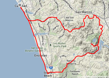 The route will start off with a warm up down the coast, heading inland on Lomas Santa Fe to warm up the legs for climbing. After passing through Rancho Santa Fe, the road changes names to the Del Dios many of us know so well, and we continue with some gentle climbing out toward Mt. Israel Road, which we hit around mile 24. As I stated earlier, the main part of the climb is about 0.7 miles, but you can continue you on the road another half mile or so until it involves crossing gates, stairs, and other things we won’t be adventurous enough to partake of on this day. This will be a great spot for a snack stop, also with great photo opportunities.