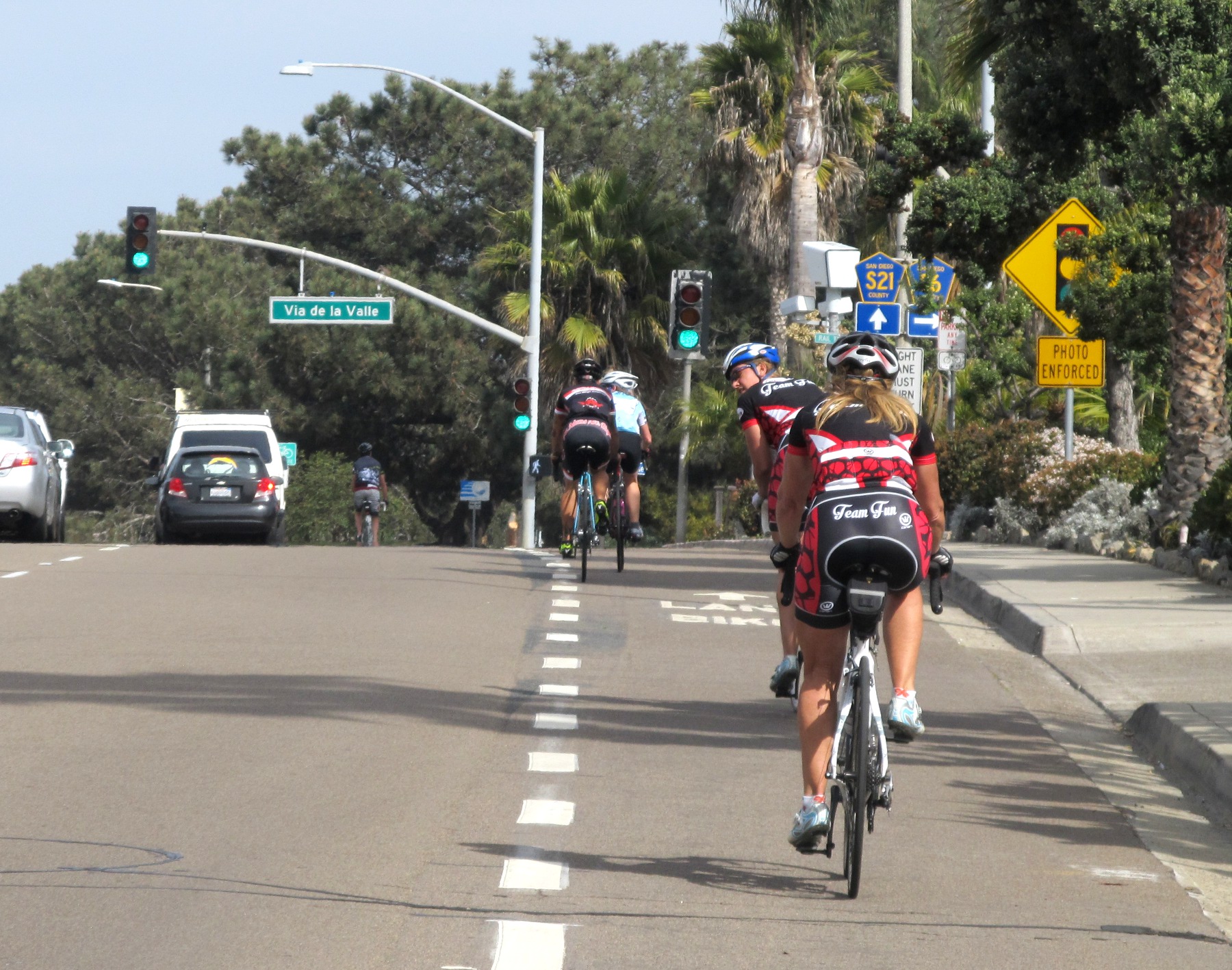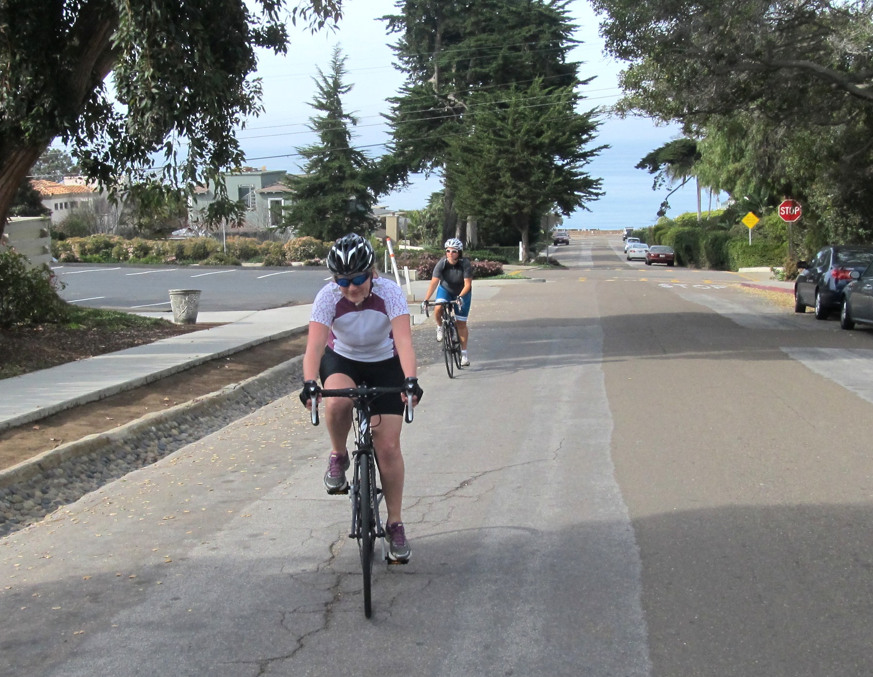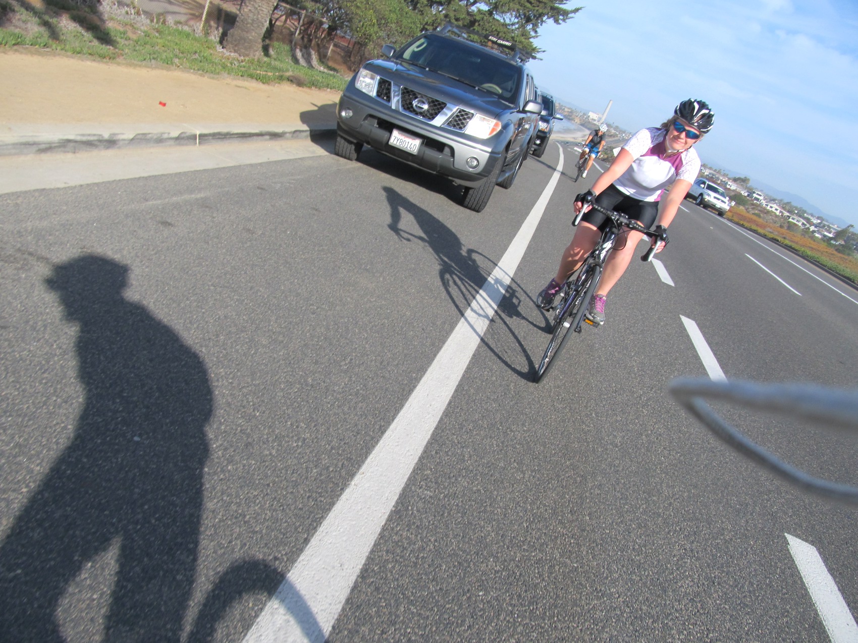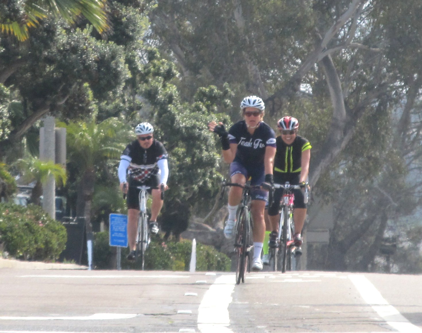 We got back to Carlsbad before noon and I decided to set up a photo ambush of Team Fun 80 milers on my way back to San Diego. It was a bit tricky finding a good spot, but I ultimately settled for the top of the Coast Hwy climb into Solana Beach (at Via de la Valle) and scored a few frontal shots. Yey! (The lasses are so fast it’s usually pretty hard to get anything but fast-disappearing rear shots of them!).