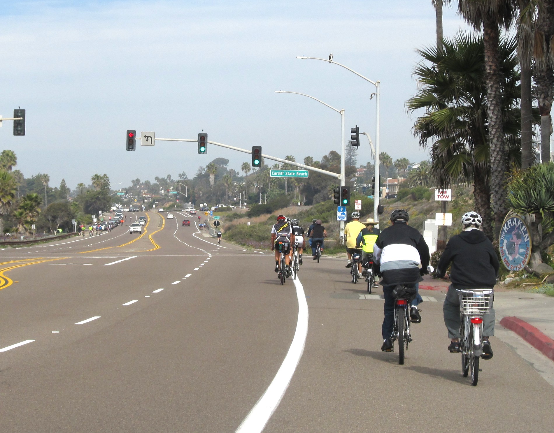 From the crest of the hill we made a careful descent down the delightfully snaky Serpentine Dr to 15th St and retraced our route north. The Coast Hwy was crowded with bicyclists this morning! Many of them were even on e-bikes (you know, the cheaters’ bike with electric engine attached to the rear hub), however. We got quite swarmed by a group of those in Cardiff where a few breezed by me on the little climb up past the well-decorated Kook… pedaling. I don’t know why they were pedaling since they were on electrical power rather than legs. Getting passed by smoothly shaved cyclists on super light bikes on a climb is all well and good, but getting whiffed by big fat engined bikes as their riders mimed pedaling at 50 rpm bugged me a bit and I was tempted to throw my peanut butter & jelly sandwiches at electric peloton.