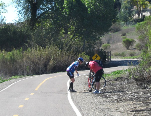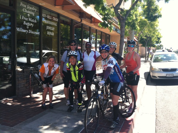 We started out as a foursome and made our way pretty brisky through Oceanside to the surprisingly clear San Luis Rey River Trail (we only passed a few joggers and cyclists and I didn’t have to use my bell much at all). We stuck together pretty well. Tammy was on a heavier hybrid bike, but gamely kept pace. Sian and Ellie have gotten quite stronger in the last couple of months and will likely graduate to the intermediate group soon! Toward the east terminus of the trail we passed Laurie & Lindsay from the intermediate group changing a rear flat and decided to wait for them on the N Santa Fe climb. The weather was getting pretty warm when they arrived and the pair agreed to ride the rest of the way back with us instead of continuing on the intermediate route. That was lucky for me as Laurie is a good ride leader and it was much better that there were two leaders (one in front and one at the back) when the group started to splinter on the hot inland climbs and also during the tricky traffic merges at SR78 and I-5. Special notice to Lindsay who fought through a heat-related crisis on the climb to Palomar Airport Rd. Everyone has a crisis every now and then, but it takes courage to not call it quit too soon when the going gets rough. She recovered nicely as we headed back to the coast. Also a very well done to Tammy who gamely conquered all the neighborhood climbs that she didn’t like (but I’m sure will soon come to love ) – on a heavier bike with uncomfortably fitted cleats to boot!