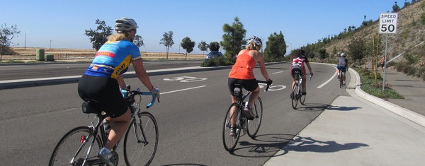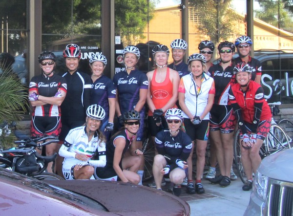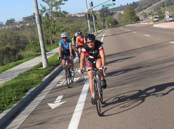 It was a fine day for climbing, and everyone at least did their best to hide their grimaces from the camera.  I know that I, for one, can’t wait for Suffer Fest #2! Here’s another ride report from Michell, who rode a bit with both the intermediate and beginner groups: “I was looking for a least lame excuse to dodge the advanced group ‘sufferfest ride’ when Christa (the beginner group ride leader this week) asked for a volunteer sweeper, so I jumped at the job!  It was quite nice. We went at a really easy-going pace. Alas, as we were supposed to turn inland on Poinsettia a bunch of big delivery trucks shielded Christa from the turn and she kept going south. Yours truly was of no help whatsoever, having gotten myself into an autopilot. Heading south on the Coast Hwy is usually a ‘home stretch’ for me. had Sian not said anything I probably would have taken them all the way down to Del Mar before realizing that we were supposed to have turned inland… like, 10 miles ago.  It was great that we had team leaders to spare for the combined intermediate – beginner group, tho. The group split on the Poinsettia rollers, so Christa & I just bookended three beginners all the way up San Elijo Hills and back. Everybody made it. Sian and Ellie had their personal best time for the climb, I think.  On the way back to the shop we ran into quite a few interesting groups. One was a peloton of fixies that went past us on a climb and made me a bit nervous on the descent (they were real fixies. Not a front brake among them, so they were rear-skidding on the way down in front of us). There was also a motorcycle bunch closer to the coast, and a bunch of costumed folks on the coast. The group was nice and tight all the way into Carlsbad. Alas, we didn’t all get in together because Gwen caught a front flat just a few blocks from the finish and the little wire that caused it refused to come out.  The nice guy in front of whose house we were stopped came out to help and we ended up leaving the wire in (just filed it down and put a piece of electrical tape over before installing new tube). That reminds me to add a pair tweezer to my repair kit.” – Michell And finally, more pictures!