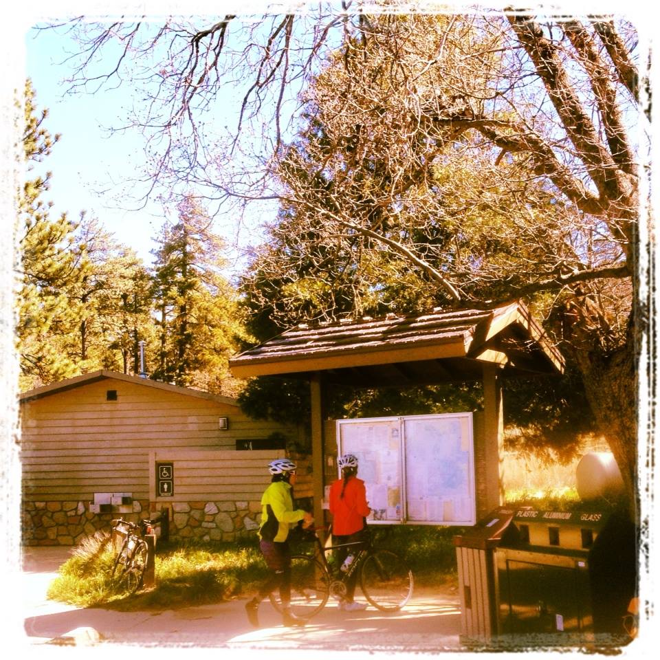 We took a little bathroom break at the Visitor’s Center, and within the short few minutes of standing still near the summit, we had at least one set of chattering teeth.  The wind was whipping up through the trees all around, and I made the tentative suggestion that perhaps it would be best to just “call it good” and head back down the south/southwest side of Sunrise Highway directly back to Pine Valley, enjoy a nice little early lunch  with some warm beverages, and feel satisfied that we at least got the Kitchen Creek climb in.  HK says, “But then it will be a very short ride!”  Defeated by her zeal (I am in fact fortunate she didn’t insist on climbing Cuyamaca Peak also), we headed off into the wilds of the wind.