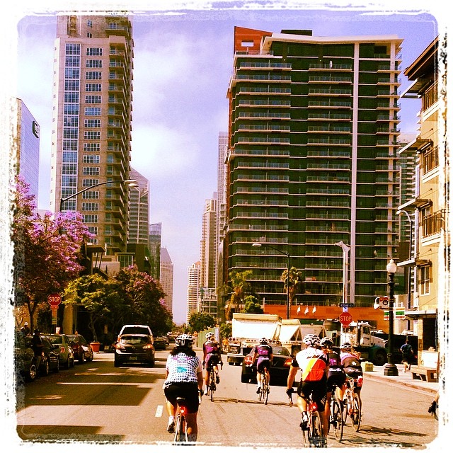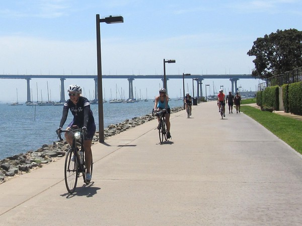 We began a group of ten at the top of Torrey Pines, and our tour first took us on the glorious descent of La Jolla Shores, winding around and past the seals and sea lions at La Jolla Cove. We usually stop for a quick photo opportunity, but that place can be a little pungent, and was particularly noxious yesterday. So we continued on through the mansions of Bird Rock, down through the hip vibe of Pacific Beach, and then entering Mission Bay Park at the north end. In spite of the somewhat stiff south/southwest wind, we loosened up our legs and were able to build up and maintain some speed through this open, flat stretch with few stops (from here one can see Sea World, another famous San Diego sight). From there, we worked our way over to Old Town, with a quick restroom stop at the train station before continuing on through to Kettner Boulevard, which we took straight through the business district of downtown. For many of the group, this was their first time riding within the city proper.