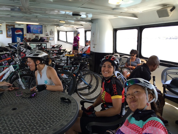 And we did – hurriedly handing the nice men manning the ferry ticketing cash for four of us at a time, we wheeled onto the bottom level of the ferry for the short ride across the bay. A little break from the sun, a little break for the legs, a little root beer in the water bottle (Jill!), and we were ready to finish out the fifteen or so miles back to the Gliderport.