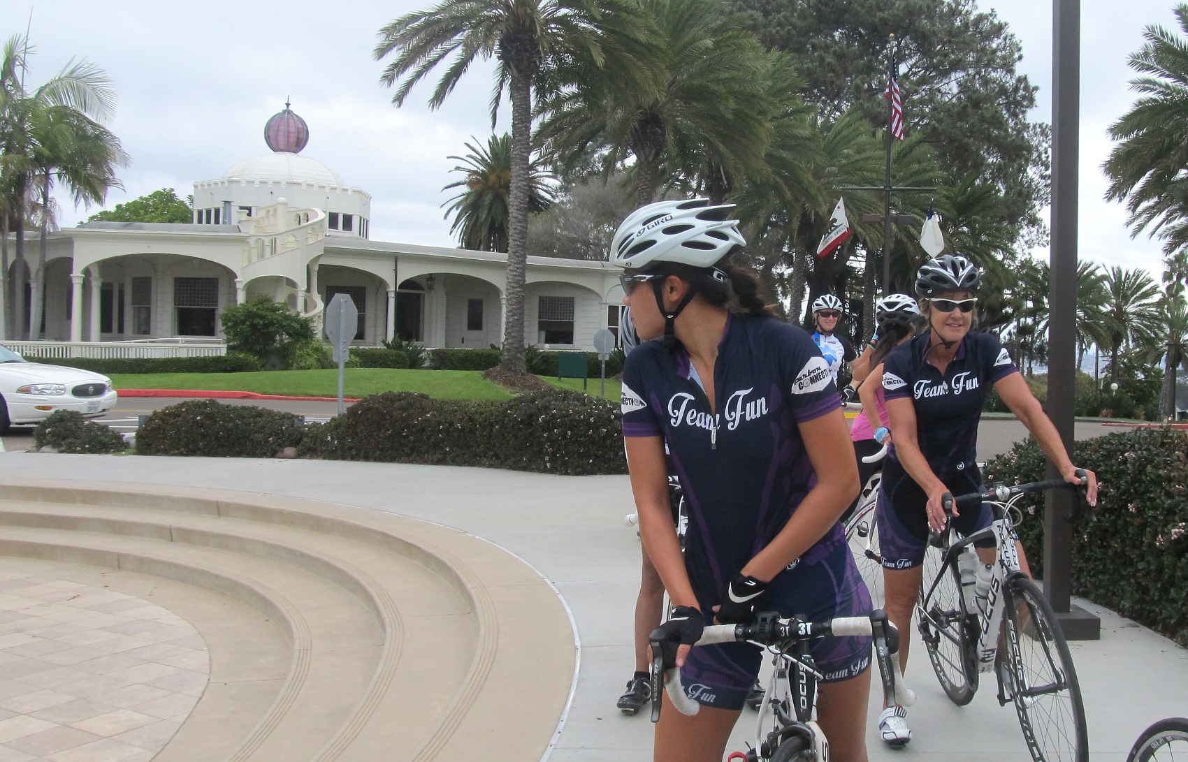 With the help of Kim Z, who ably swept everyone up to Catalina Blvd, we took a scenic detour onto Pt Loma Nazarene University off Lomaland Dr on the west side of Catalina Blvd and spent some legs-shaking time admiring the remnants of Theosophy architecture on the beautiful campus. Yours truly actually tried, without success, to explain to both groups that they could avoid a rather dreadful climb by turning back the way we came to the university entrance rather than following Pepper Tree Ln down Lomaland’s Horrendous Dip of Doom. To my sadistic delight, everybody followed me down the steep and gorgeously curvy drop to the cliff just above Sunset Cliffs Natural Park… gamely putting up with my moaning and groaning about how all the strategically placed downhill speed bumps are so effective at preventing me from being able to sling shot at least part of The Climb.