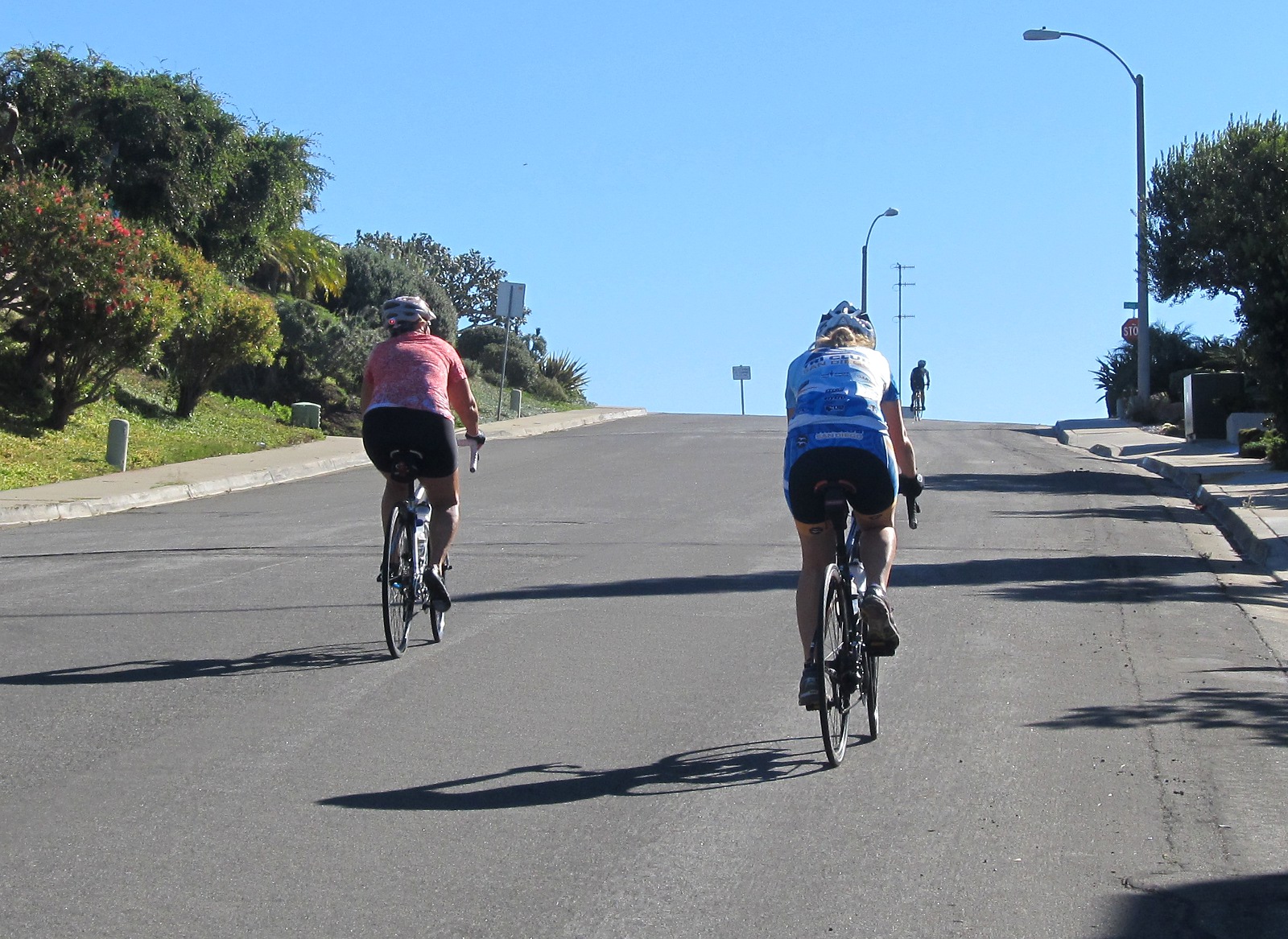 The C group quintet led by heat-phobic Michell (AKA me) stayed on the mellow coast all the way to Del Mar, where a jolty crossing of the railroad track caused me to forget that C ride was supposed to be hill-less…