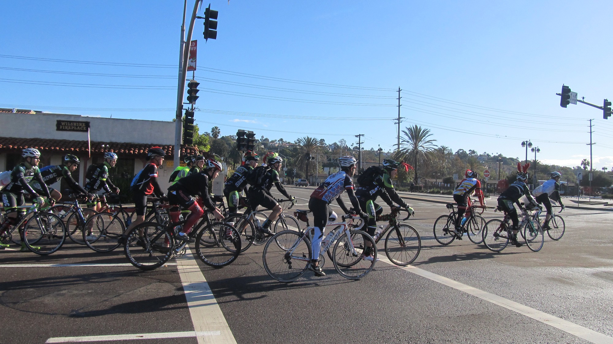 We wondered how we had gain such stardom… until we were caught by a large peloton of Santas the Taylor St traffic light in Old Town. It was the San Diego Bicycle Club (SDBC)’s annual Holiday Toy Ride! The Santas (along with many elves) made the turn into Old Town on Taylor St, on their way to delivering the toys at Kroc Center in Redwood Village area. For all our hamming for the cameras, we weren’t the main draw after all!