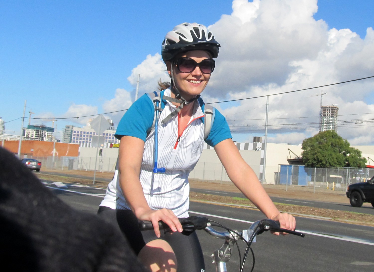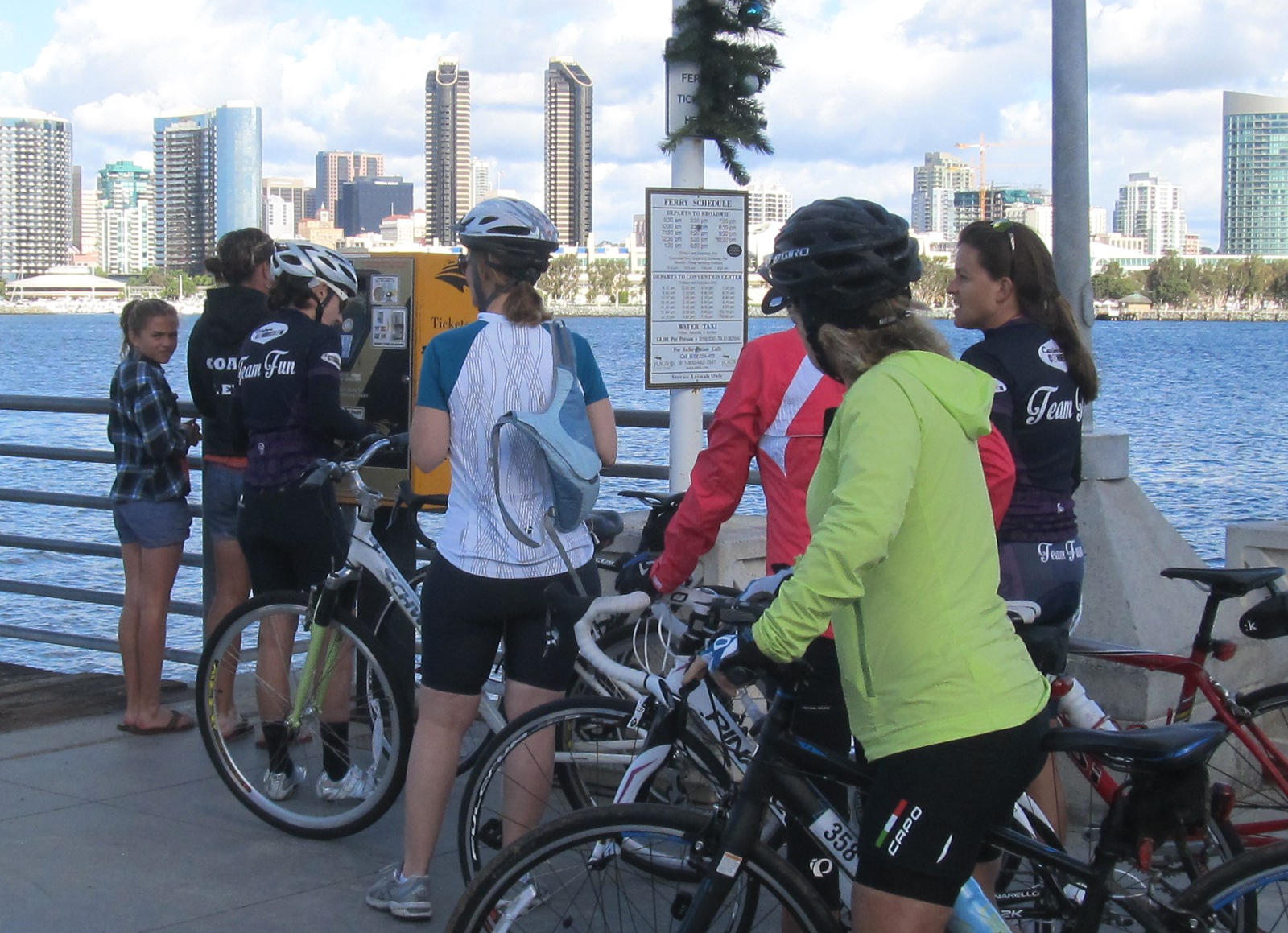 We decided to ride as a single group instead of breaking into B and C. Brielle, Miki and Gretchen were on hybrid bikes rather than road bikes, which was great at enforcing a mellow ‘sight-seeing’ pace (gosh know that’s necessary when there are two Heathers in the group!). We passed quite a few friendly photographers who were stationed along E Mission Bay Rd and Pacific Hwy toward Downtown, training their camera on us as we made our way south…