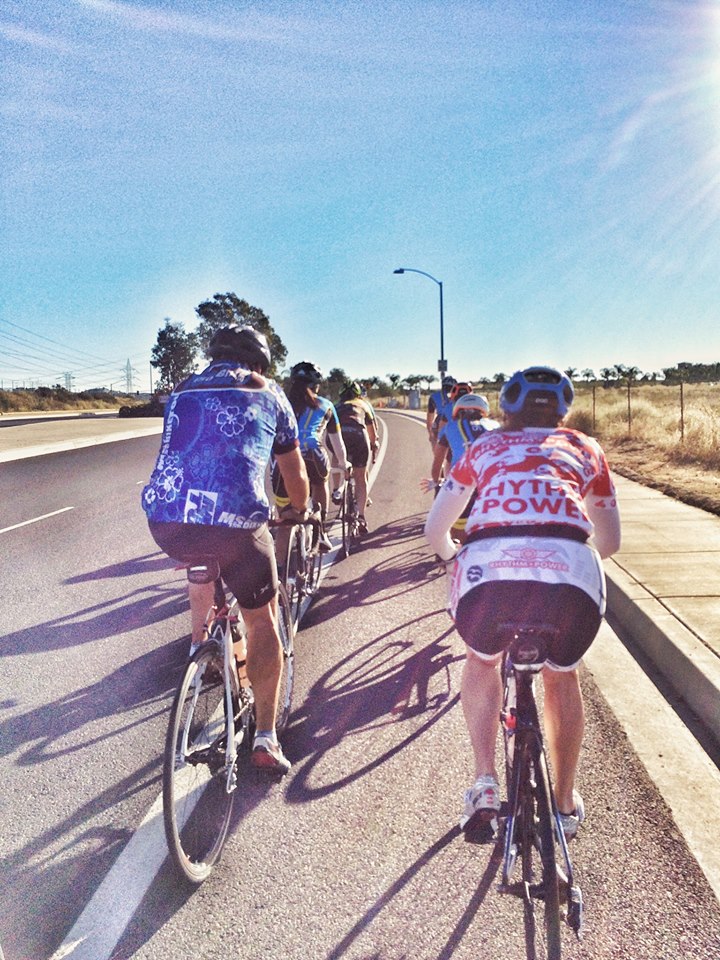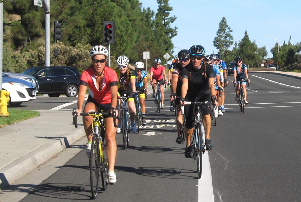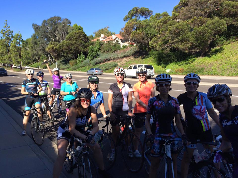 All three groups worked their way south and east on the road-with-three-names:  starting out as College, the road changes to Aviara then Alga, but never really gets any easier.  The A and C groups overlapped on this stretch, and Michell happened to snap some great shots of the larger group just after Poinsettia.