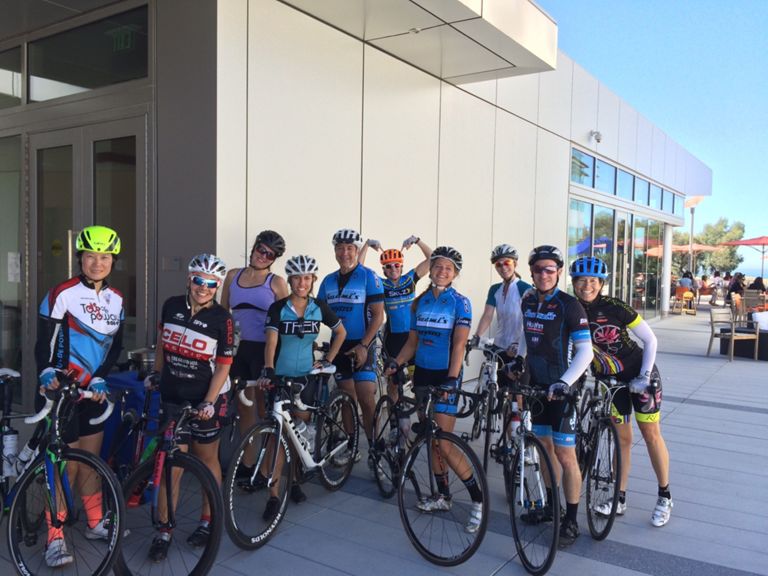 While it seems strange to say this while I am shivering in my office from the cold of the last few days, Saturday was certainly on the hot side. Bottles started to run low, and around the time we finished our ascent of Gilman (Stan and I may or may not have raced another group ride to the top…), a water stop was a necessity. As we wound around through the UCSD campus and back out to Torrey Pines Road, Heather K remembered one of our favorite post-ride stops near the Gliderport – the Bella Vista Cafe. The very friendly staff there allowed everyone to refill with ice water, and we were on our way back to Nytro.